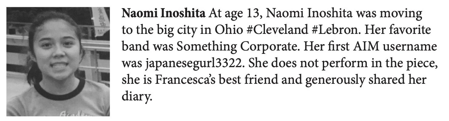 This project was performed in New Ohio’s 2018 Season, New Ohio’s Ice Factory 25 (Guest curated by Pig Iron Theatre Company), FringeArts in January 2018 and in the 2017 Philadelphia Fringe Festival. Dear Diary LOL was supported in part by a grant from Small But Mighty Arts and a Foundation for Contemporary Arts Emergency Grant. Dear Diary LOL received support from the New York Theatre Workshop annual Usual Suspects summer residency at Adelphi University, and Bethany Arts Community. An initial iteration of this piece was presented at the 2015 Pig Iron School “Dares” Festival.